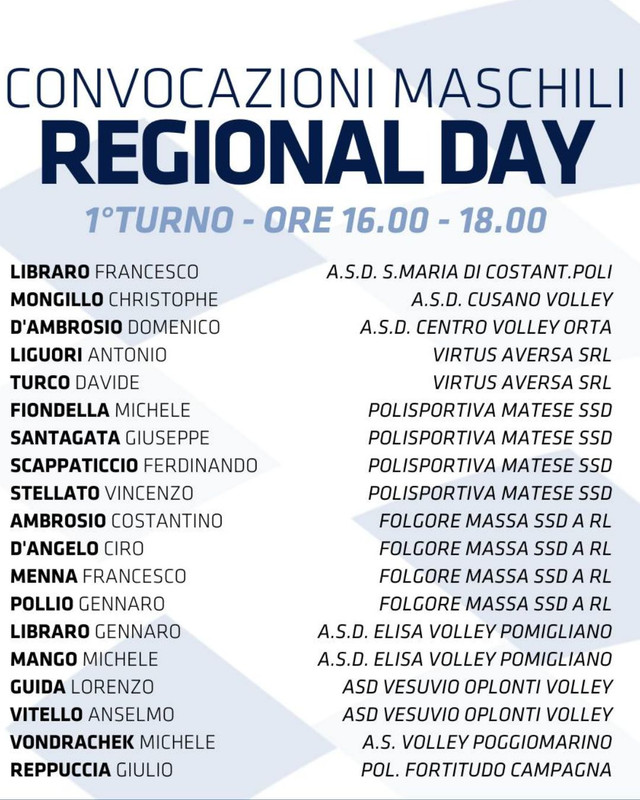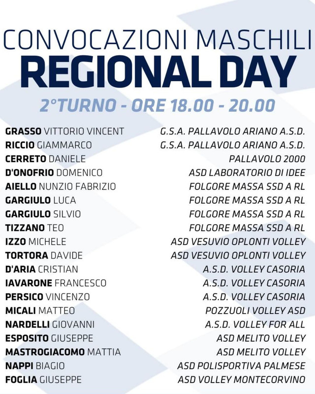 Nel pomeriggio di martedì 19 novembre, al PalaVesuvio di Napoli, si è svolto il secondo Regional Day maschile del 2024, affidato al tecnico federale Vincenzo Fanizza e al suo staff. Per circa 4 ore, divisi in due gruppi, 38 atleti delle annate 2010 e 2011 sono stati sottoposti al consueto programma di schedatura e di didattica sul piano atletico e tecnico (nella fattispecie: misure antropometriche, tecniche di riscaldamento, fasi di gioco e misurazione del salto) con particolare attenzione alla battuta in salto spin e all'ibrida.