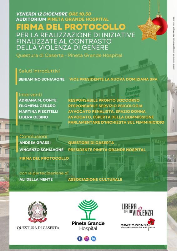 Venerdì 12 dicembre, alle ore 10.30, presso l’auditorium del Pineta Grande Hospital, si terrà la firma del protocollo d’intesa tra la Questura di Caserta e il Pineta Grande Hospital, finalizzato alla realizzazione di iniziative congiunte per il contrasto alla violenza di genere e il sostegno alle vittime.