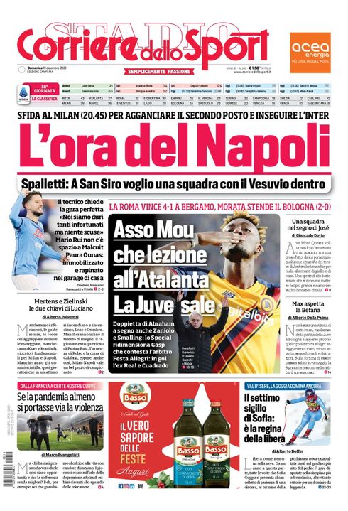 "L'ora del Napoli". Il Corriere dello Sport, nell'edizione campana, apre con la sfida al Milan (20:45) per agganciare il secondo posto e inseguire l'Inter. Spalletti: "A San Siro voglio una squadra con il Vesuvio dentro".
