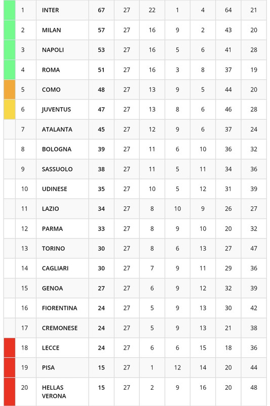 L'Udinese, grazie al successo contro la Fiorentina, sale a quota 35 punti e si porta così al decimo posto. I viola, invece, restano fermi a quota 24 punti in piena zona retrocessione, a pari punti con con Cremonese e Lecce. Ecco la classifica della Serie A al termine della 27esima giornata: