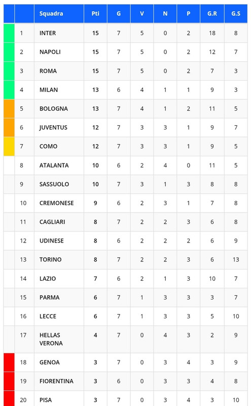 Terminate le sfide di domenica alle 15 per la settima giornata di Serie A. Genoa e Parma guadagnano solo un punto a testa. Nessun gol al Marassi. Il Genoa aggancia Fiorentina e Pisa a 3 punti, i ragazzi di Cuesta con 6 punti si mettono a -1 dalla Lazio. Invece, in Sardegna il Bologna espugna Cagliari con due gol che si traducono nell'aggancio al Milan a 13 punti.