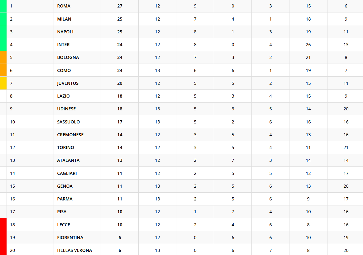 Nelle partite in programma alle ore 15:00 vincono Genoa e Udinese, rispettivamente contro Hellas Verona e Parma. La squadra di Daniele De Rossi sale a quota 11 punti, agganciando Cagliari e Parma. L'Udinese va a 18 punti con la Lazio. L'Hellas Verona resta ultimo a 6 punti. Ecco la classifica provvisoria della 13esima giornata.