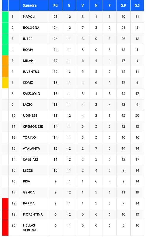 Di seguito, la classifica provvisoria della 12esima giornata.