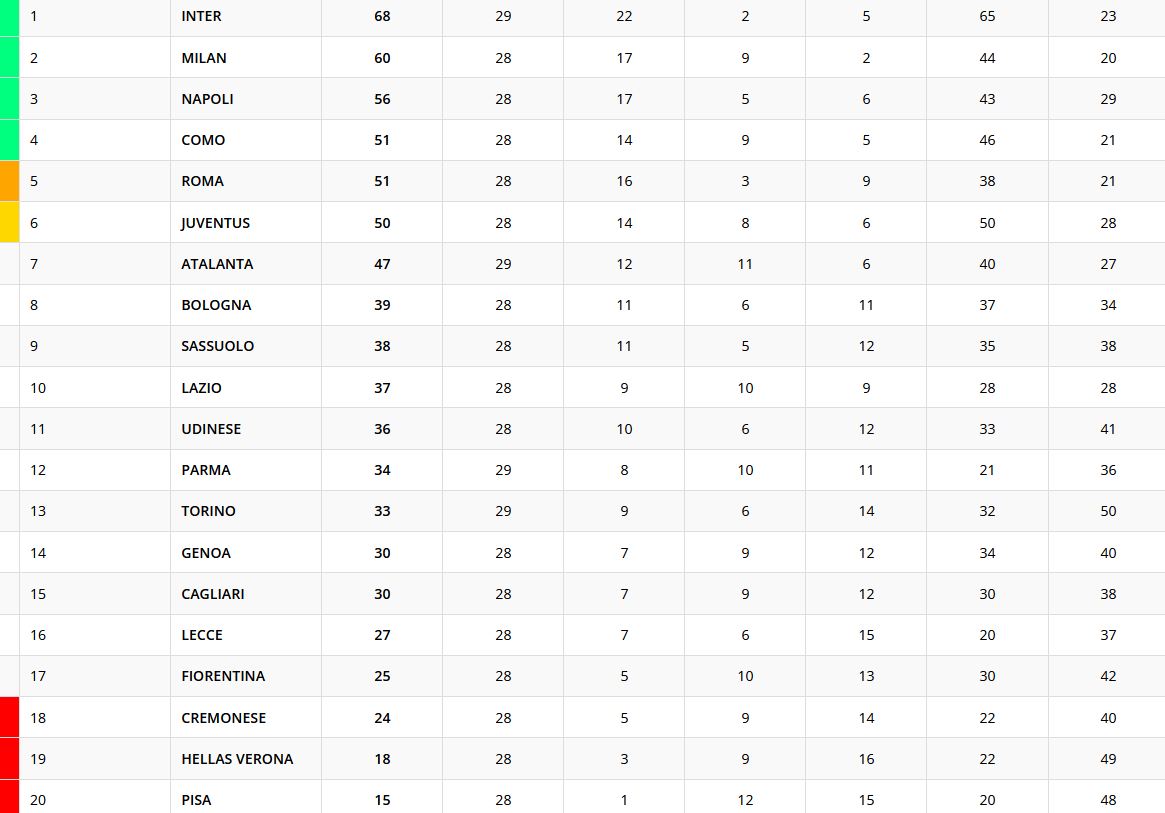 Termina in parità il match tra Inter e Atalanta, match valido per la 29esima giornata di Serie A. Inter a +8 sul Milan, mentre la Dea sale a 47 punti, a -3 dalla Juventus. Ecco la classifica provvisoria della 29esima giornata.