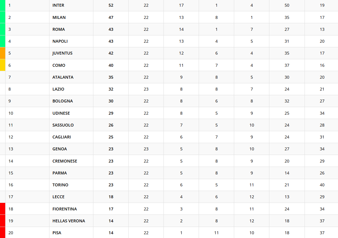 La Lazio vince all'Olimpico contro il Genoa, nel match valido per la 23esima giornata di Serie A. I biancocelesti salgono a quota 32 punti, a -3 dall'Atalanta. La squadra di Daniele De Rossi, invece, resta a quota 23 punti con Torino, Parma e Cremonese. Ecco la classifica provvisoria della 23esima giornata.