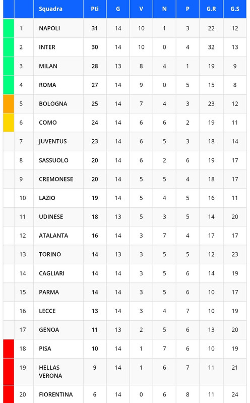 Ecco classifica provvisoria della 14esima giornata di Serie A.