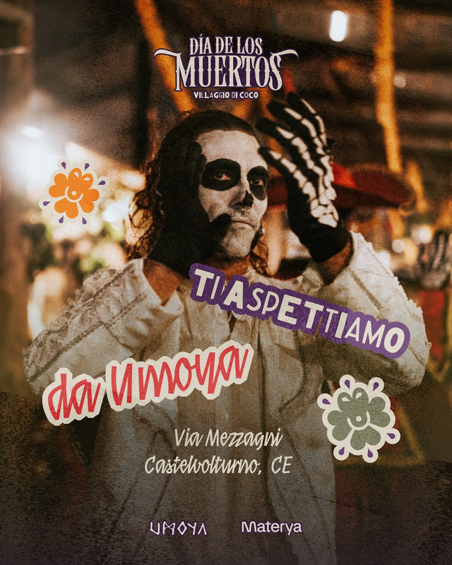 Un viaggio nella cultura messicana tra magia, musica e nuove esperienze per celebrare l’ “amor más allá de la muerte” che si terrà dal 18 ottobre al 2 novembre 2025, torna da Umoya – Ecoparco del Mediterraneo di Castel Volturno (CE) – il Día de los Muertos - Villaggio di Coco. Un evento che celebra la vita oltre la morte in un’esplosione di colori, tradizioni e spettacoli ispirati alla più iconica delle festività messicane. Un’esperienza unica, prodotta in collaborazione con Materya, laboratorio creativo di allestimenti e scenografie. Una manifestazione che ha ottenuto il patrocinio del Consolato del Messico e della Comunità Messicana a Napoli, confermato anche quest’anno dopo il riconoscimento ricevuto nella passata edizione. Un villaggio tra sogno e realtà: Il pubblico sarà accolto in un mondo sospeso tra il “regno dei vivi” e quello “dei morti”: scenografie immersive, altari colorati, luminarie, fiori e i tradizionali papeles picados trasformeranno ogni angolo dell’Umoya in un piccolo frammento di Messico. Tra profumi, musica e spiritualità, il Día de los Muertos è un viaggio emozionale, un’occasione per celebrare l’amore e il ricordo di chi non c’è più, in perfetto equilibrio tra folklore e contemporaneità.