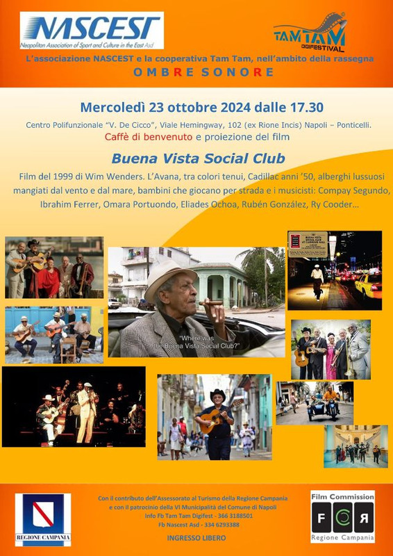 Quinto appuntamento con il cinema e la musica al Tam Tam Digifest, la rassegna itinerante a cura del giornalista Giulio Gargia che quest'anno ha come tema le Ombre Sonore. Mercoledì 23 ottobre ore 17.30 al Centro Polifunzionale per Anziani 'V. De Cicco' – in viale Hemingway 102 (ex Rione Incis) Ponticelli, sarà proiettato il film Buena Vista Social Club di Wim Wenders, una pellicola del 1999 che racconta dell'Avana tra colori tenui, Cadillac anni '50, alberghi lussuosi mangiati dal vento e dal mare, bambini che giocano per strada e musicisti: Compay Segundo, Ibrahim Ferrer, Omara Portuondo, Eliades Ochoa, Rubèn Gonzàles, Ry Cooder. Il film nasce per caso da un progetto di Ry Cooder, noto chitarrista statunitense, che nel 1996 parte per Cuba con l'intento di registrare una session che non avrà mai luogo. Il musicista decide di dare un senso al viaggio e non sprecare l'occasione di trasformarlo in qualcos'altro. Così realizza in sei giorni un disco insieme con dei musicisti locali attempati. Wim Wenders si lascia contagiare dall'entusiasmo di Cooder e decide di seguire il gruppo all'Avana e in tournée. Il Buena Vista Social Club diventa un progetto cinematografico e discografico, oltre che un fenomeno mondiale per vendite di dischi e notorietà.