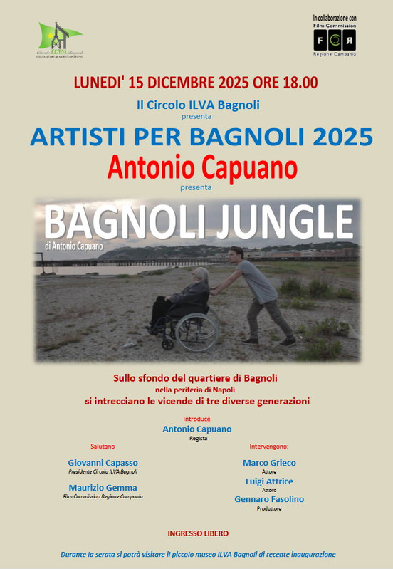 A seguire, gli attori Marco Grieco, Luigi Attrice e il produttore Gennaro Fasolino dialogheranno con il pubblico, condividendo esperienze, aneddoti dal set e il loro personale rapporto con Bagnoli. L’incontro sarà introdotto dal regista Antonio Capuano, che accompagnerà gli spettatori alla scoperta delle motivazioni, dei linguaggi e delle atmosfere che hanno guidato la realizzazione di Bagnoli Jungle.
