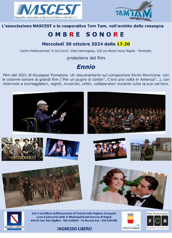 Proseguono gli appuntamenti settimanali di cinema e musica di Ombre Sonore, nell’ambito della rassegna Tam Tam Digifest, curata da Giulio Gargia. Mercoledì 30 ottobre, ore 17.30, al Centro Polifunzionale per Anziani V. De Cicco di Ponticelli, verrà proiettato “Ennio” di Giuseppe Tornatore, un omaggio appassionato al maestro Ennio Morricone, uno dei più grandi compositori della nostra epoca. L’appuntamento del 30 ottobre offre al pubblico un’esperienza che va oltre la semplice visione di un film: è una finestra aperta sulla storia del cinema e della musica, capace di coinvolgere anche chi non è esperto del settore grazie alla sua struttura avvolgente e alla ricca aneddotica.