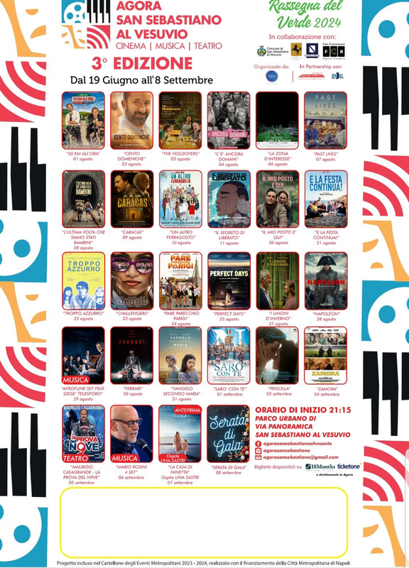 Agorà San Sebastiano al Vesuvio, nell’ambito della Rassegna del Verde 2024, gode del sostegno del Comune di San Sebastiano al Vesuvio - Ambito 28, Città Metropolitana di Napoli, Regione Campania e Film Commission e proporrà, fino all’8 settembre 2024, film, spettacoli e concerti.