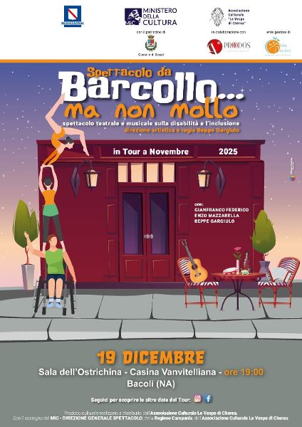 Un viaggio tra musica, teatro e disabilità approda alla sua tappa conclusiva: il tour nazionale dello “Spettacolo da BARcollo ma… non mollo” va in scena venerdì 19 dicembre alle ore 19.00 alla Casina Vanvitelliana – Sala dell’Ostrichina di Bacoli (Napoli). Si tratta di un progetto artistico multidisciplinare che intreccia musica, canto, teatro, danza e drammaturgia in un’unica esperienza scenica, nato dall’incontro di tre artisti con percorsi differenti ma accomunati da una profonda sensibilità umana e da un obiettivo condiviso: trasformare la fragilità in forza creativa, raccontando con ironia e poesia la relazione tra arte e disabilità.