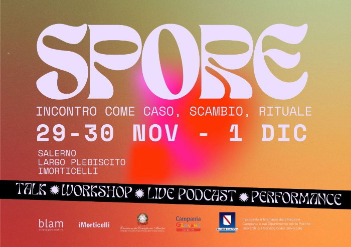 Prende il via il 29 novembre la prima edizione di “SPORE”, tre giorni di eventi, da venerdì 29 a domenica 1 dicembre, interamente progettati da under-35, che coinvolgeranno iMorticelli, nel centro storico di Salerno, per riflettere insieme sul tema dell’Incontro nelle sue possibili declinazioni: caso, scambio, rituale.