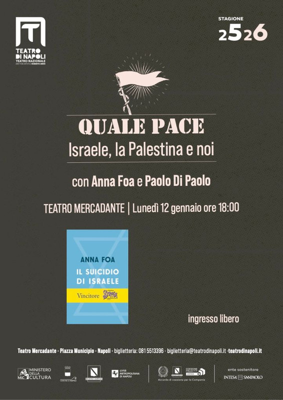 Nuovo appuntamento per ciclo di eventi promosso dal Teatro Nazionale di Napoli a latere della programmazione teatrale, dedicato a temi centrali del dibattito culturale, sociale e politico della contemporaneità. Lunedì 12 gennaio alle ore 18 al Teatro Mercadante sarà ospite d’eccezione Anna Foa, tra le massime esperte italiane di storia ebraica e vincitrice del Premio Strega Saggistica 2025, in dialogo con lo scrittore Paolo Di Paolo. L’incontro, dal titolo Quale pace. Israele, la Palestina e noi, sarà introdotto da Roberto Andò direttore artistico del Teatro di Napoli.