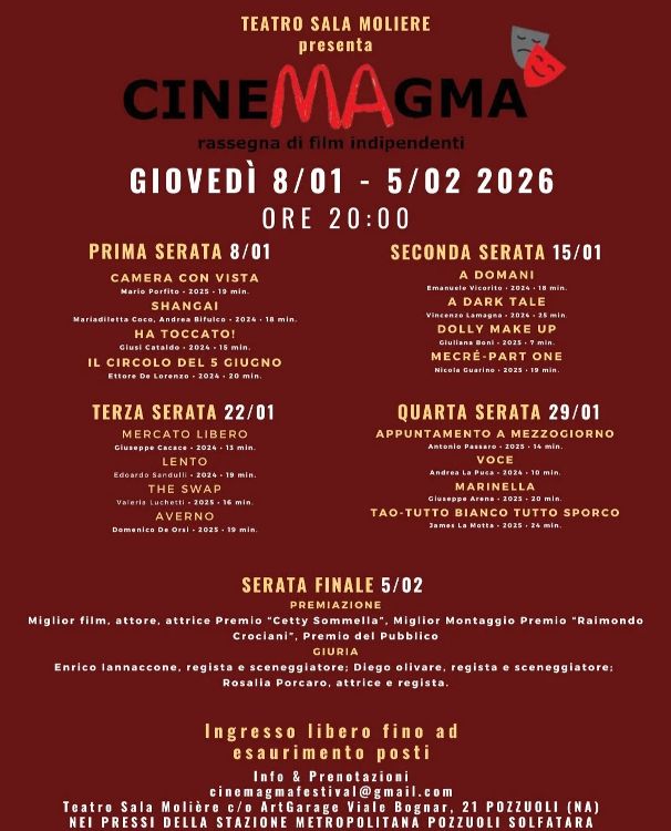 Dopo il successo della serata di apertura, giovedì 15 gennaio 2026, alle ore 20.00, al Teatro Sala Molière di Pozzuoli (in ArtGarage - Via Bognar, 21) diretto da Nando Paone, arriva il secondo appuntamento di “Cinemagma”, la rassegna di film indipendenti selezionati dallo storico del cinema Giuseppe Borrone e giunta alla sesta edizione. Lo scopo dell’iniziativa, presentata dall’Associazione Culturale I Dieci Mondi, è quello di offrire una vetrina ai talenti emergenti del cinema italiano, focalizzando l’attenzione sul formato breve del cortometraggio.