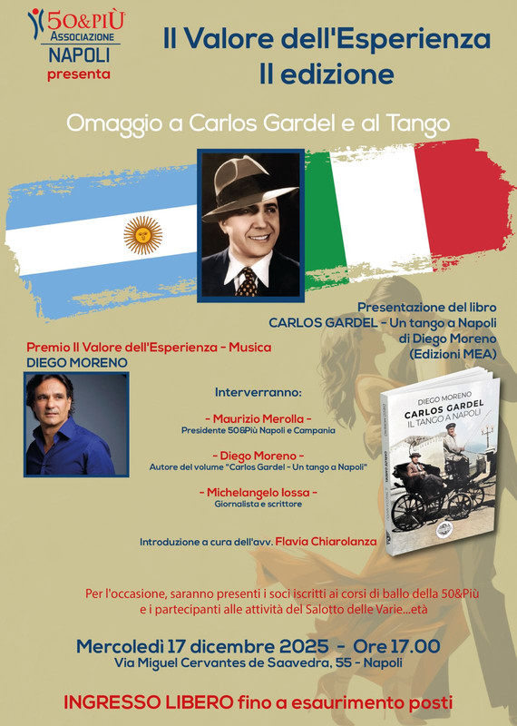L’ultimo appuntamento del 2025 si terrà mercoledì 17 dicembre alle ore 17:00 la sede della 50&Più di Napoli ospita l'autore Diego Moreno per la presentazione del suo ultimo libro su Carlos Gardel. L’incontro sarà, infatti, dedicato alla figura del leggendario “Re del Tango” e vedrà protagonista il volume “CARLOS GARDEL - Un tango a Napoli” (Edizioni MEA).