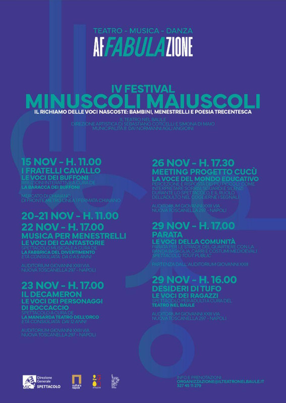 Promosso dal Comune di Napoli nell’ambito del progetto Affabulazione e finanziato con il contributo del Fondo nazionale per lo spettacolo dal vivo della Direzione Generale Spettacolo del Ministero della Cultura, “Minuscoli/Maiuscoli” conferma la sua vocazione di spazio aperto e inclusivo, dove le arti sceniche diventano strumento di partecipazione. Sotto la direzione artistica di Sebastiano Coticelli e Simona Di Maio, il progetto invita ancora una volta a riscoprire il valore della parola, del gesto e del racconto come forme di resistenza e rinascita collettiva.