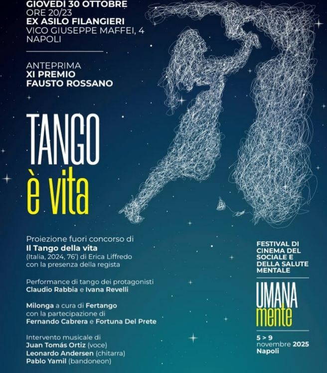Il grande evento di anteprima “Tango è vita” giovedì 30 ottobre, alle ore 20.00, all’Ex Asilo Filangieri di Napoli, segnerà la partenza dell’XI edizione del Premio Fausto Rossano - Festival di Cinema del Sociale e della Salute Mentale che quest’anno, con il titolo “UMANAmente”, si svolgerà dal 5 al 9 novembre 2025 principalmente tra l’Ex Asilo Filangieri e il Teatro Bolivar, oltre a vedere coinvolti altri luoghi significativi della città di Napoli come l’Università Federico II – Dipartimento di Scienze Sociali Campus San Giovanni, The Spark Creative Hub, Casa Cinema Napoli, I.S.I.S. Alfonso Casanova. Il “Premio”, ideato e organizzato da Marco Rossano con la direzione artistica di Sergio Sivori e realizzato con il contributo della Regione Campania e della Fondazione Film Commission Regione Campania, gode del sostegno della Fondazione Pio Monte della Misericordia con i patrocini del Dipartimento di Scienze Sociali della Federico II, della Fondazione Una Nessuna Centomila e della Fondazione Limpe.