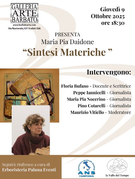 Sarà inaugurata giovedì 9 ottobre 2025, alle ore 18.30, la mostra “Sintesi Materiche” di Maria Pia Daidone, alla “Galleria Arte Barbato”, Via Nazionale, 327 – Scafati (SA), curata dal sociologo e critico d’arte Maurizio Vitiello, in collaborazione con il Dipartimento Campania dell’Associazione Nazionale Sociologi e della casa editrice “la Valle del Tempo” con cui l’artista ha realizzato copertine di alcune pubblicazioni negli ultimi anni.