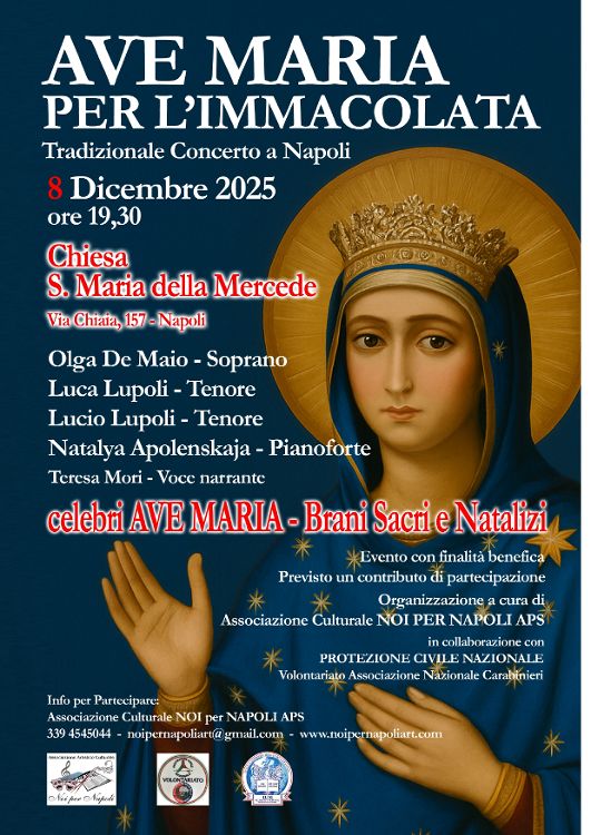 Napoli rinnova uno dei suoi appuntamenti più attesi dell’Avvento: “Ave Maria per l’Immacolata”, il concerto mariano dell’Associazione Culturale Noi per Napoli APS, divenuto negli anni un simbolo della tradizione musicale e spirituale della città.