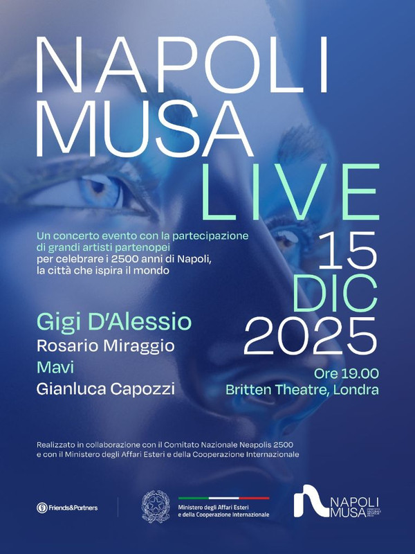 Sbarca a Londra il Napoli Musa Live: dopo il grande successo di Piazza del Plebiscito, il Comitato Nazionale Neapolis 2500 porta la musica napoletana sul palcoscenico internazionale del Britten Theatre il prossimo 15 dicembre con un nuovo concerto-evento.