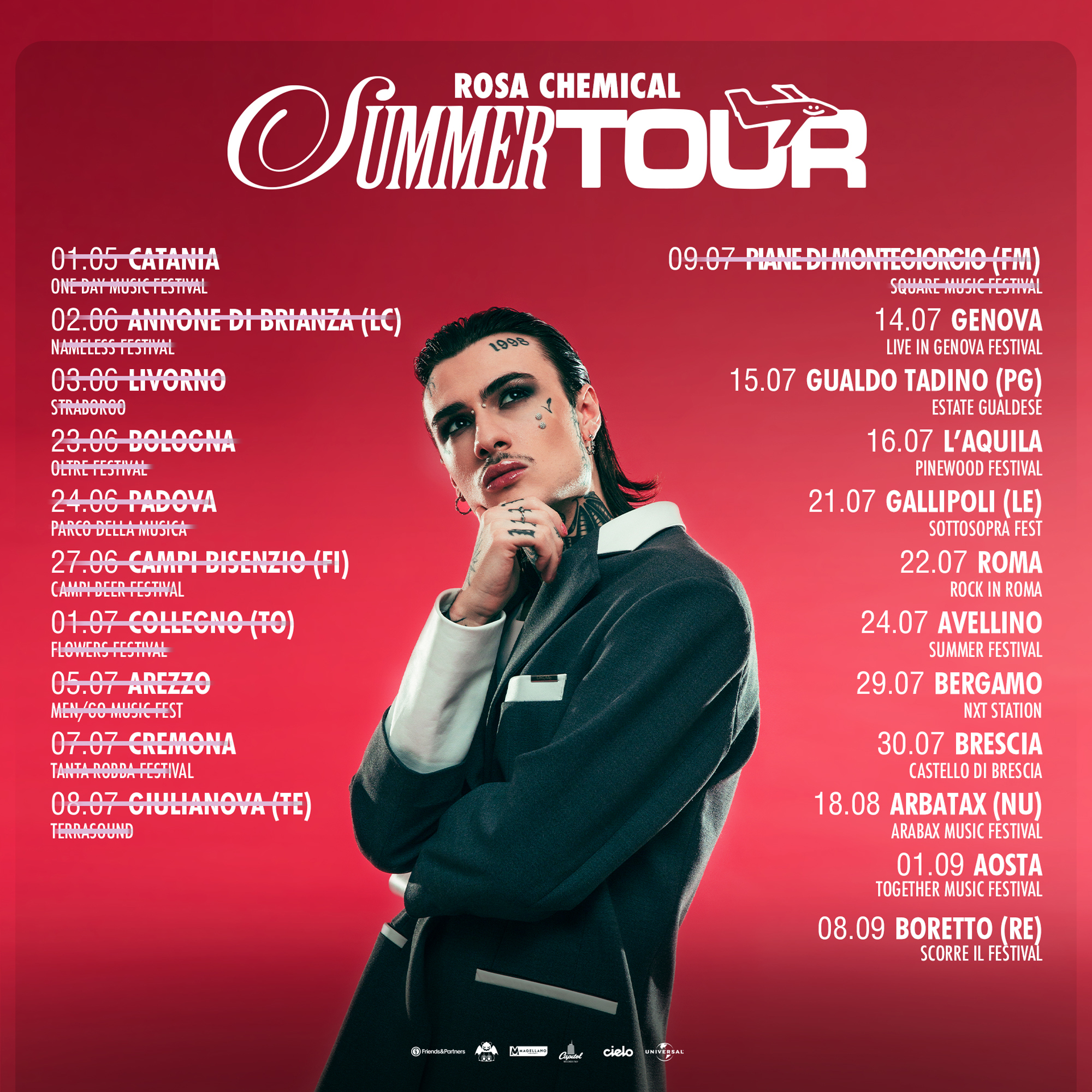 Il viaggio estivo di Rosa Chemical è cominciato il 2 giugno al Nameless Festival di Annone di Brianza (LC) ed è proseguito il 3 giugno allo Straborgo di Livorno, il 23 giugno all’Oltre Festival di Bologna e il 24 giugno al Parco della Musica di Padova. Rosa Chemical si è esibito poi il 27 giugno in occasione del Campi Beer Festival di Campi Bisenzio (FI), il 1 luglio al Flowers Festival di Collegno (TO), il 5 luglio al Men/Go Music Fest di Arezzo, il 7 luglio al Tanta Robba Festival di Cremona, l’8 luglio al Terrasound di Giulianova (TE) e il 9 luglio allo Square Music Festival di Piane di Montegiorgio (FM). Sarà nuovamente on stage il 14 luglio al Live in Genova Festival di Genova, il 15 luglio all’Estate Gualdese di Gualdo Tadino (PG), il 16 luglio al Pinewood Festival di L’Aquila, il 21 luglio al Sottosopra Fest di Gallipoli (LE), il 22 luglio al Rock In Roma di Roma, il 24 luglio al Summer Festival di Avellino, il 29 luglio al NXT Station di Bergamo, il 30 luglio presso il Castello di Brescia di Brescia e, infine, concluderà con due date alla fine dell’estate - il 18 agosto all’Arabax Music Festival di Arbatax (NU) e il 1 settembre al Together Music Festival di Aosta.