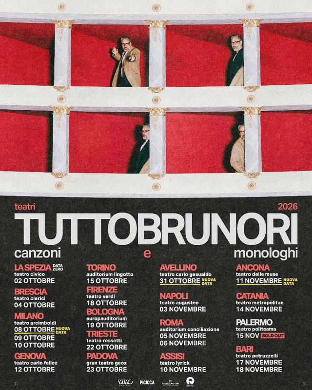 Il calendario di TUTTOBRUNORI, CANZONI E MONOLOGHI -il nuovo tour nei teatri di Brunori Sas prodotto da Vivo Concerti- si arricchisce oggi di tre nuove date per il prossimo anno: se Milano si fa in tre, con il nuovo appuntamento al Teatro degli Arcimboldi in programma giovedì 8 ottobre, lo show toccherà anche le città di Avellino (sabato 31 ottobre @ Teatro Gesualdo) e Ancona (mercoledì 11 novembre @ Teatro delle Muse).