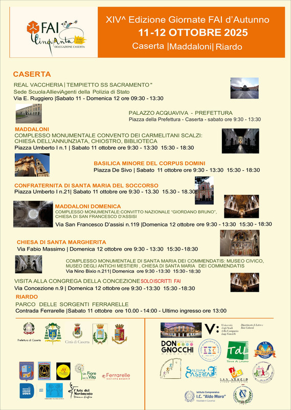 Il FAI – Fondo per l’Ambiente Italiano è una fondazione senza scopo di lucro nata nel 1975, sul modello del National Trust, con il fine di tutelare e valorizzare il patrimonio storico, artistico e paesaggistico italiano, quest’anno festeggia i 50 anni di attività e, per la provincia di Caserta, ha organizzato aperture in tre comuni: il capoluogo stesso, Riardo e un focus su Maddaloni con due giorni di aperture, spettacoli e visite guidate.