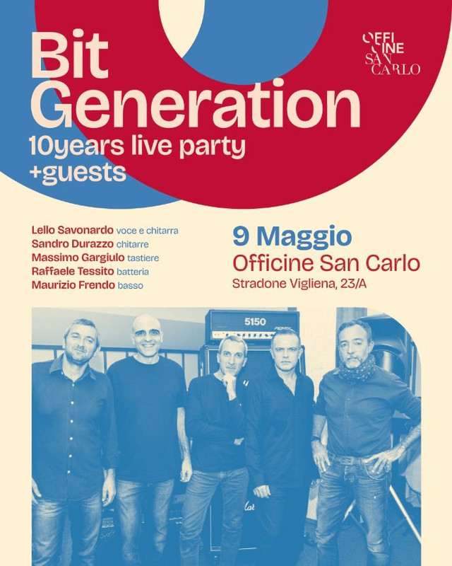 L’evento musicale Bit Generation live party, che si terrà il 9 maggio 2025 alle ore 21:00 presso le Officine San Carlo a cura del sociologo-cantautore Lello Savonardo, rappresenta un viaggio di suoni, parole, ritmi ed emozioni che raccontano, attraverso la musica, il mutamento culturale e sociale, i linguaggi espressivi, le forme di comunicazione e i disagi delle diverse generazioni. Nel corso dell’evento saranno eseguiti da Lello Savonardo e dalla sua SBAND, insieme ad alcuni ospiti del disco e della scena musicale partenopea, i brani musicali scritti e interpretati dal sociologo-cantautore e pubblicati nel concept album Bit Generation, prodotto da “la Canzonetta” nel 2015 e rieditato nella versione vinile nel 2023. Il progetto crossmediale Bit Generation compie 10 anni.