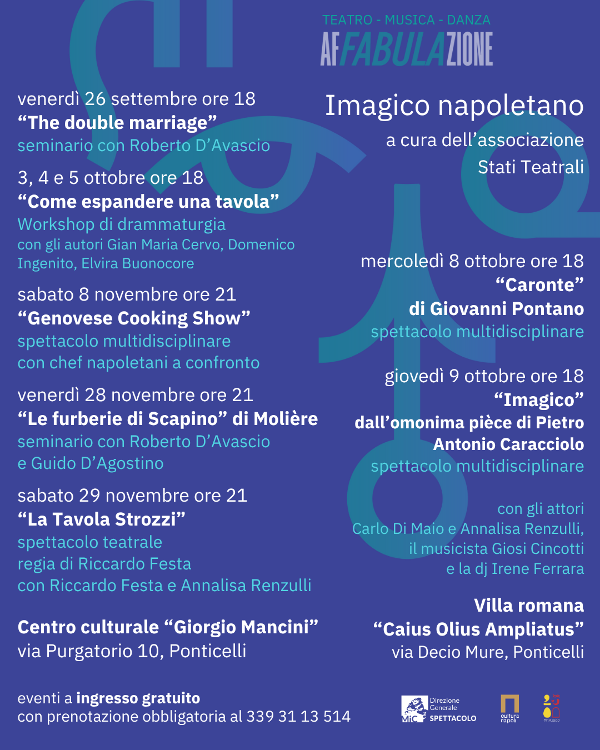 Le iniziative di Stati Teatrali reinterpretano e attualizzano i grandi classici. Dopo il focus su “The double marriage” e il workshop di drammaturgia "Come espandere una tavola" che hanno animato il centro culturale Mancini si prosegue con diversi altri eventi a partecipazione gratuita tra ottobre e novembre. Mercoledì 8 ottobre, ore 18, l’antica villa romana di Napoli Est, grazie alla sinergia con il Rotary Community Corp Napoli Est, farà da cornice al reading di "Caronte" di Giovanni Pontano. Giovedì 9 ottobre, stessa location e orario, lo spettacolo teatrale "Imagico" dall'omonima pièce di Caracciolo cui segue un dj set di Irene Ferrara. Nelle due date sono coinvolti gli attori Carlo Di Maio e Annalisa Renzulli insieme al musicista Giosi Cincotti.