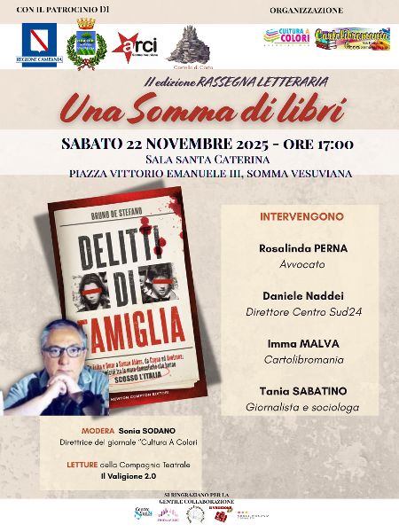 Sabato 22 novembre 2025, alle ore 17:00, la Sala Santa Caterina in piazza Vittorio Emanuele IIII a Somma Vesuviana ospiterà la presentazione del libro “Delitti di famiglia” (ed. Newton Compton) di Bruno De Stefano, un’indagine lucida e documentata sulle tragedie familiari che hanno profondamente segnato l’opinione pubblica italiana.
