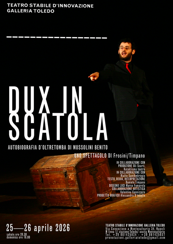 Un attore – solo in scena con l’unica compagnia di un baule che viene spacciato come contenente le spoglie mortali di “Mussolini Benito” – racconta in prima persona le rocambolesche vicende del corpo del duce, da Piazzale Loreto nel ’45 alla sepoltura nel cimitero di San Cassiano di Predappio nel ’57. Alle avventure post-mortem del cadavere eccellente si intrecciano brani di testi letterari del Ventennio, luoghi comuni sul fascismo, materiali tra i più disparati provenienti da siti web neofascisti, nel tentativo di tracciare Il percorso di Mussolini nell’immaginario degli italiani, dagli anni del consenso agli anni della nostalgia.diventa palcoscenico in cui il sottile limite tra illusione e la realtà sembra svanire in una pace che evocata rimanda a quell’orizzonte di speranza e velata malinconia che chiude la commedia.