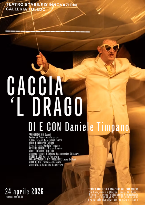 Una partitura musicale contemporanea per nulla bambinesca, anzi piuttosto novecentesca, accompagna la narrazione ed anima musicalmente gli impulsi ritmici della parola e del gesto. Un racconto scenico per voce, corpo e pianoforte; insospettabilmente beckettiano, inevitabilmente divertente. Caccia ‘L drago è uno spettacolo ispirato ad un racconto di J. R. R. Tolkien ma che guarda al Futurismo, al Dadaismo, a Beckett e Joyce, al piglio anarchico di Carmelo Bene ed alla musica contemporanea colta del ‘900. Tolkien non è qui per caso: il Tolkien antimodernista, il professorotto di Oxford, il creatore di mondi e di linguaggi, l’evasore fiscale dalla Modernità viene qui - con arbitrario e violento atto amorevole - spietatamente ricollocato nel contesto culturale e musicale opprimente della modernità; viene tuffato in pieno ‘900 e l’effetto è stridente e soffocante. Frosini / Timpano e Scarti Centro di Produzione Teatrale di Innovazione riprendono – ad oltre 20 anni dalla prima versione auto-prodotta dello spettacolo – il monologo di Daniele Timpano, che gli valse il premio " Le voci dell'anima – incontri teatrali 2005”, con un nuovo allestimento e una nuova produzione per la scena e per il tempo presenti.