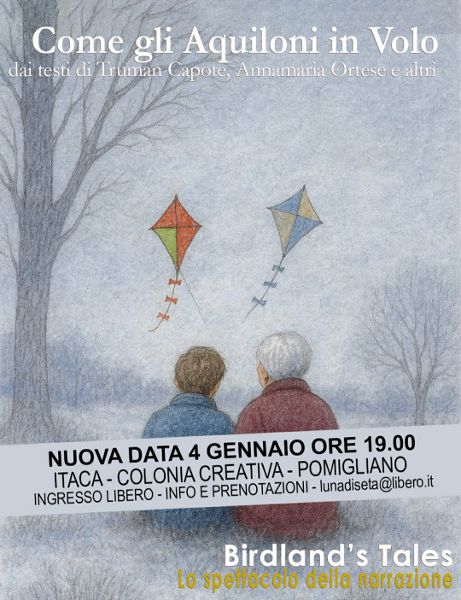 Birdland’s Tales torna a Pomigliano D’Arco (Na), domani, domenica 4 gennaio 2026, alle ore 19.00, nella Colonia Creativa “Itaca” (in Via Carducci 7) con il nuovo capitolo di narrazione “Come gli aquiloni in volo” di e con Massimo Piccolo. Lo spettacolo, a conclusione delle feste, sarà dedicato al tema del Natale e alla sua magia più intima.