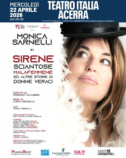 Il Teatro Pubblico Campano, diretto da Alfredo Balsamo, porta in tour “Sirene, sciantose, malafemmene ed altre storie di donne veraci”, spettacolo che vede protagonista Monica Sarnelli, scritto da Federico Vacalebre con la regia di Carlo Cerciello. Lo spettacolo, in un’edizione completamente rinnovata, è prodotto da RitmiUrbani Network, Lazzara Felice, Andreano Management.
