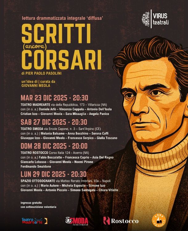 La compagnia Virus Teatrali, da sempre attenta alle voci disturbanti e analitiche del mondo della cultura italiana e internazionale, dopo aver reso omaggio dieci anni fa, il 2 Novembre 2015, alla figura di Pier Paolo Pasolini e a una raccolta di suoi articoli giornalistici pubblicati sui maggiori quotidiani italiani nei tre anni circa precedenti il suo brutale assassinio, ovvero i meglio conosciuti ‘Scritti Corsari’, ora indicati come ‘Scritti (ancora) Corsari’, ha deciso di riproporre la lettura interpretativa dei 25 articoli contenuti in quella raccolta, ma con una formula differente.