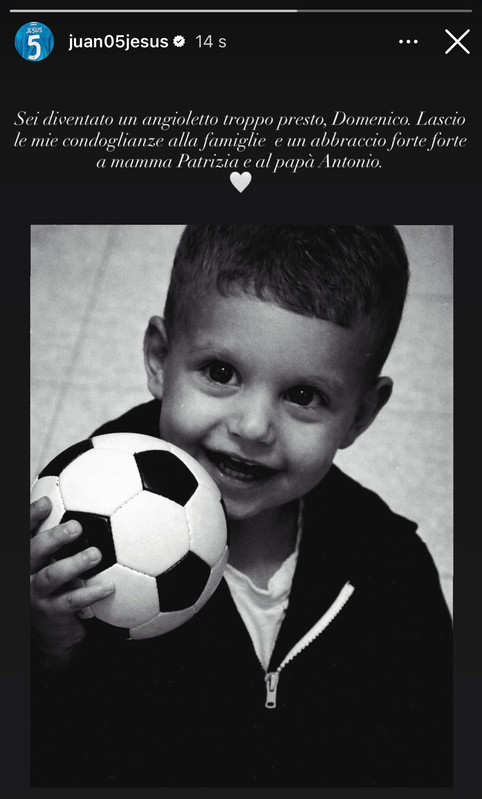 Juan Jesus, difensore del Napoli, ha dedicato un pensiero su Instagram al piccolo Domenico, il bambino di appena due anni morto dopo il trapianto di un cuore danneggiato: "Sei diventato un angioletto troppo presto, Domenico. Lascio le mie condoglianze alla famiglia e un abbraccio forte forte a mamma Patrizia e papà Antonio".
