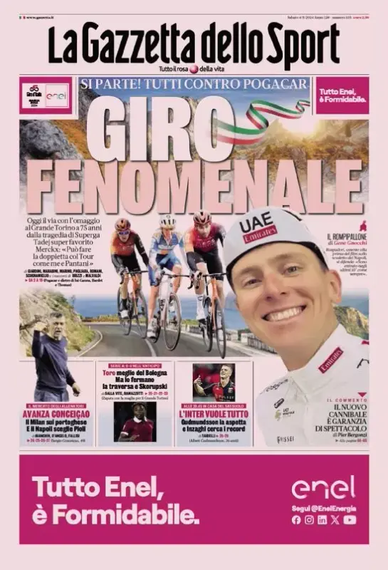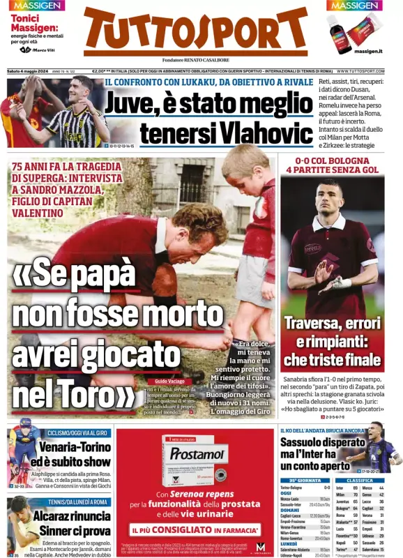 Le prime pagine sportive dei quotidiani in edicola oggi, sabato 4 maggio, aprono con le sfide della 35esima giornta della Serie A, un'intervista a Sandro Mazzola ed il futuro della panchina del Napoli.