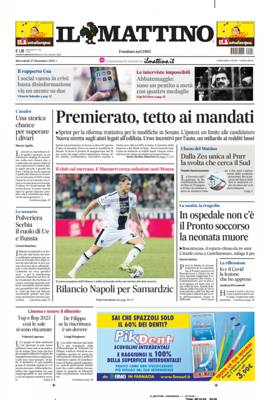 Nello spazio centrale della prima pagina odierna de "Il Mattino" si parla del calciomercato del Napoli.