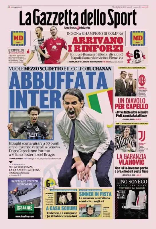 Le prime pagine sportive dei quotidiani in edicola mercoledì 27 dicembre si concentrano sulla prossima giornata di Serie A e non solo.