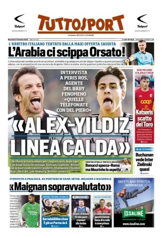 Nello spazio centrale della prima pagina odierna di "Tuttosport" si parla di Yildiz e di Del Piero. In basso spazio al Milan.