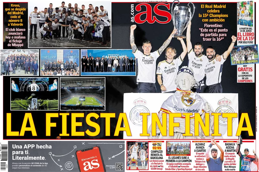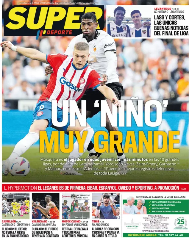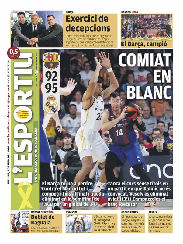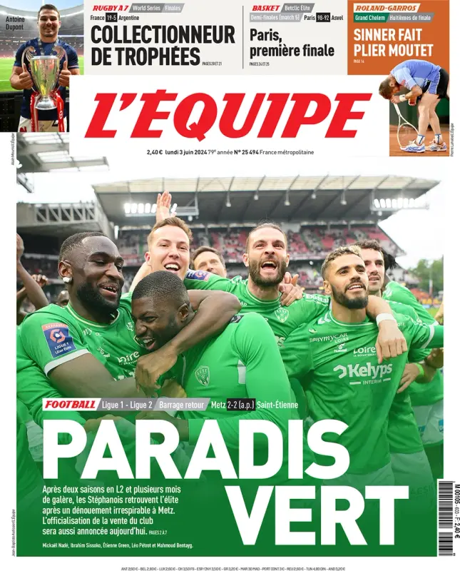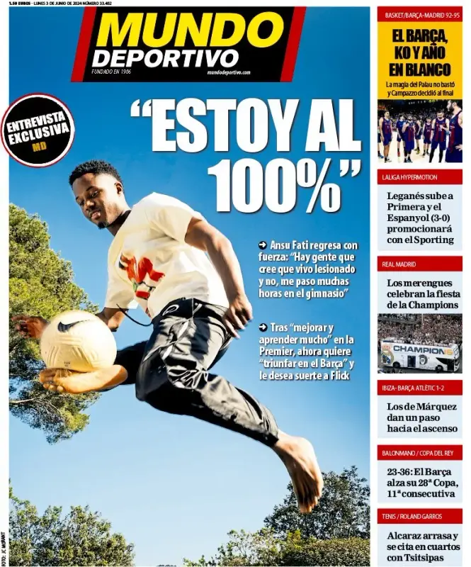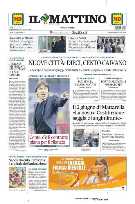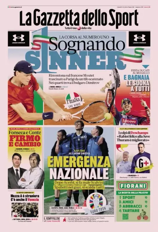 I principali quotidiani di lunedì 3 giugno aprono in prima pagina con la possibile partenza di Chiesa dalla Juventus, l'imminete approdo di Conte al Napoli, il passaggio di Sinner ai quarti del Roland Garros e la vittoria di Bagnaia al Mugello in MotoGP.
