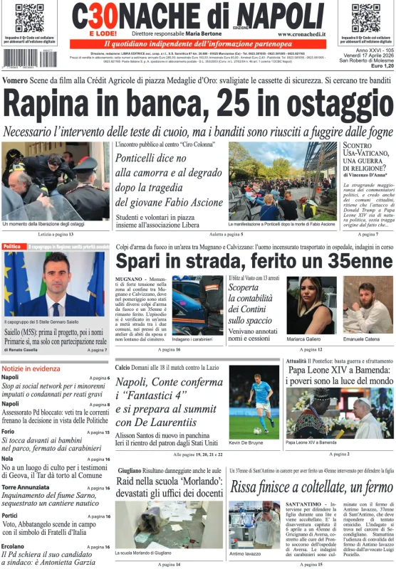Vigilia di Napoli-Lazio. Archiviato il sogno scudetto, gli azzurri devono blindare la Champions League. A tentare di rovinare i piani di Antonio Conte c'è Maurizio Sarri, ex azzurro che spesso è riuscito nel suo intento. "Napoli, Conte conferma i 'Fantastici 4' e prepara il summit con De Laurentiis, Alisson Santos di nuovo in panchina", scrive Cronache di Napoli in prima pagina. Ecco la rassegna stampa di venerdì 17 aprile 2026.