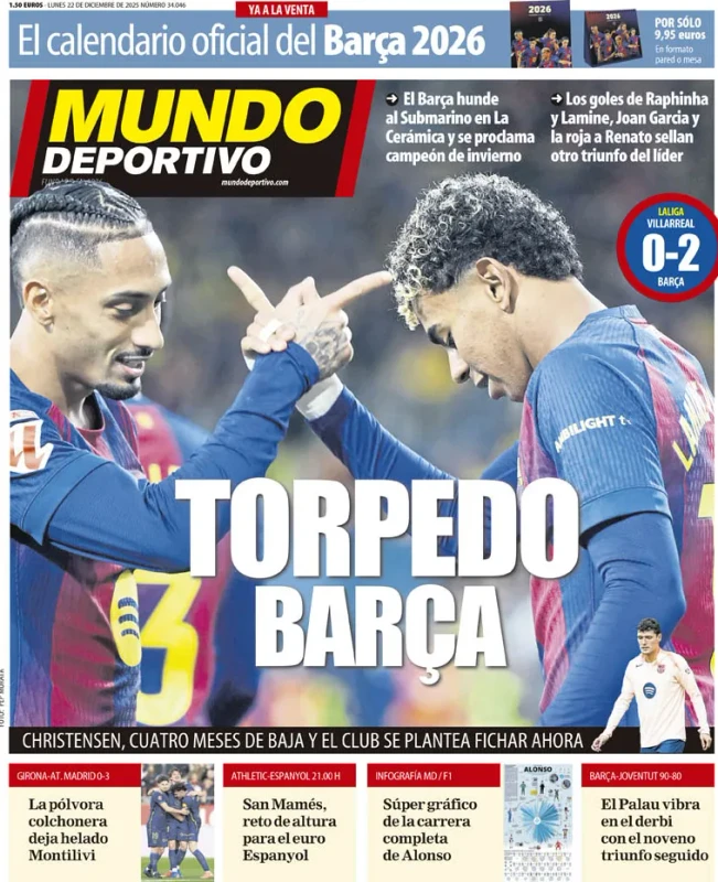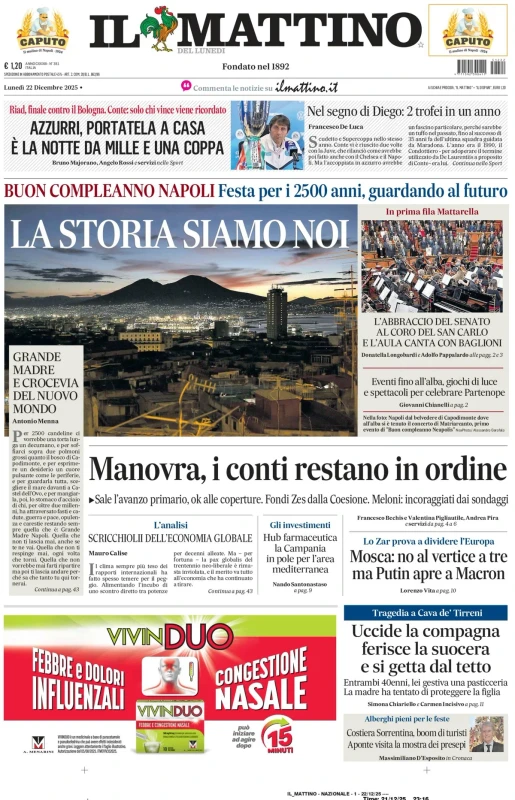 La finale di Supercoppa italiana tra Napoli e Bologna, la 16esima giornata di Serie A e molto altro sulle prime pagine dei quotidiani nazionali e sportivi in edicola lunedì 22 dicembre 2025. Il Mattino apre con "Azzurri, portatela a casa: è la notte da mille e una coppa". Riyadh, finale contro il Bologna. Conte: "Solo chi vince viene ricordato". Infine, "Nel segno di Diego: 2 trofei in un anno".