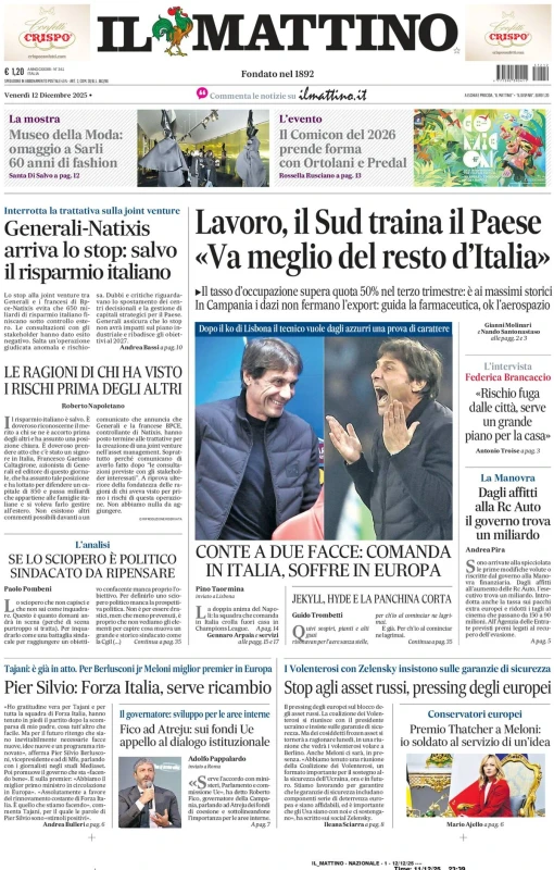 Si conclude la tre giorni europea. Il Napoli non trova la vittoria in Portogallo contro il Benfica. Il passivo di 2-0 in Champions (terza sconfitta in trasferta in Europa) arriva dopo le due grandi prestazioni con Roma e Juventus. "Conte a due facce: comanda in Italia, soffre in Europa", si legge sulla prima pagina de Il Mattino. Ecco la rassegna stampa di venerdì 12 dicembre 2025.