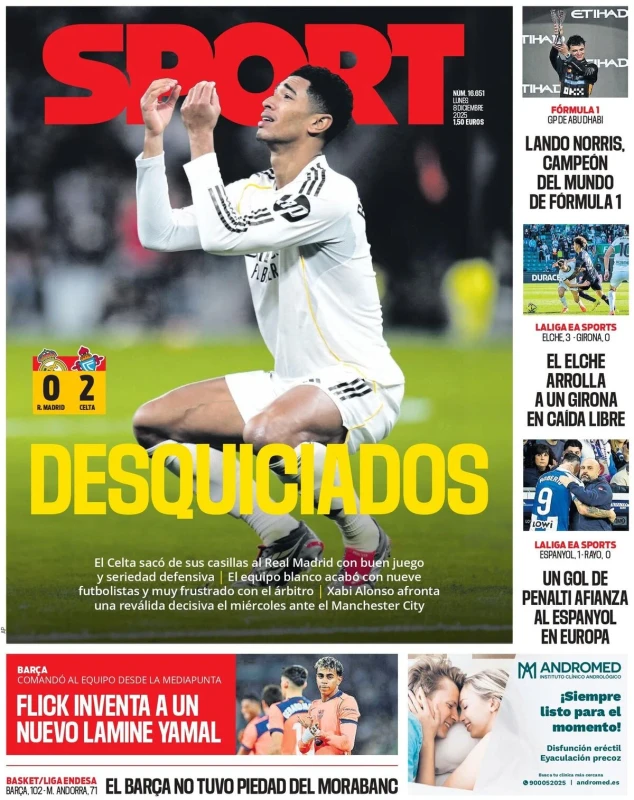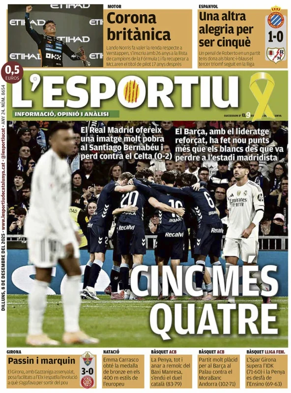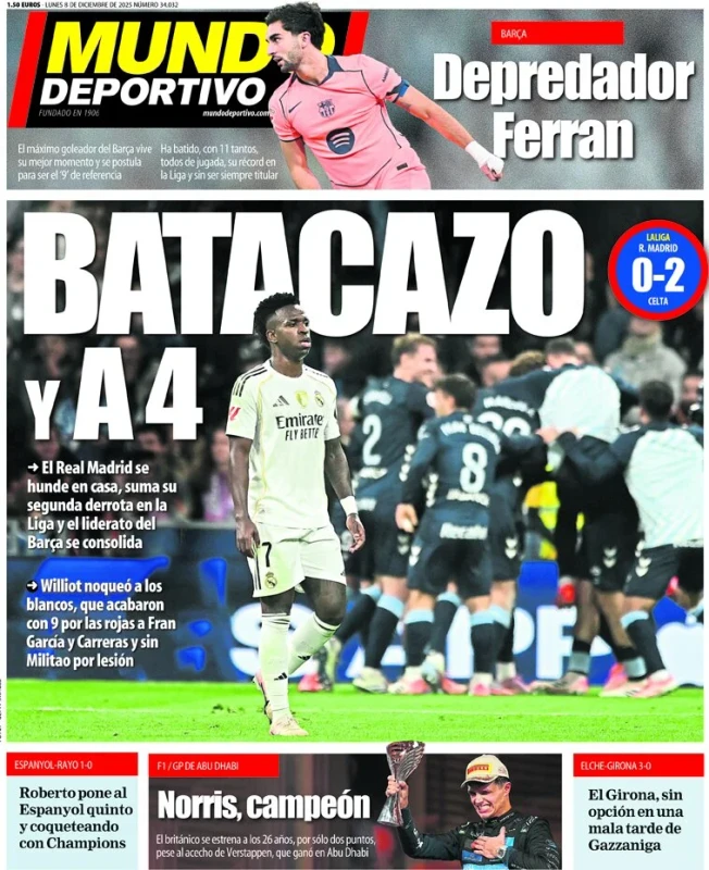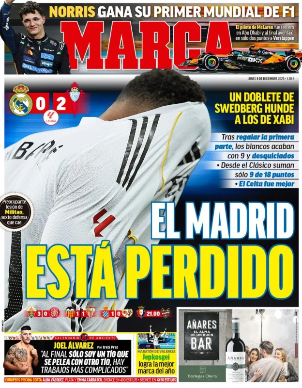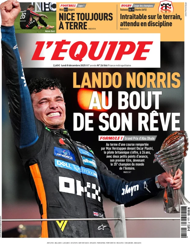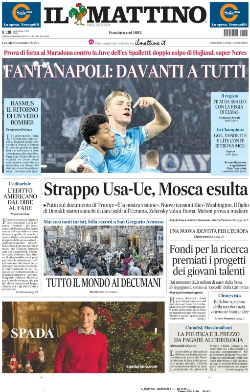 La vittoria del Napoli contro la Juventus, il programma della 14esima giornata di Serie A, Lando Norris campione del mondo di Formula 1 e molto altro sulle prime pagine dei quotidiani nazionali e sportivi in edicola lunedì 8 dicembre 2025. Il Mattino apre con "FantaNapoli: davanti a tutti". Prova di forza al Maradona contro la Juve dell'ex Spalletti: doppio colpo di Hojlund, super Neres. Poi i commenti "Rasmus, il ritorno di un vero bomber"; il regista "film da sballo con la regia di Elmas". Sguardo anche alla Champions "Gol, vendette e liti: Conte ritrova Mou".