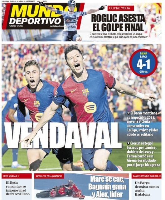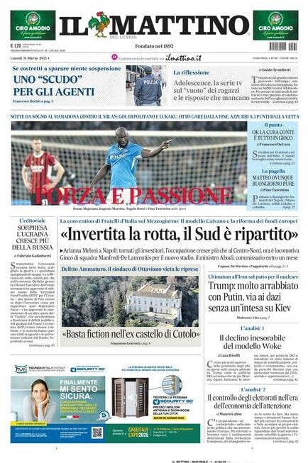 La vittoria del Napoli contro il Milan al Maradona e molto altro sulle prime pagine dei quotidiani in edicola lunedì 31 marzo. Il Mattino celebra il successo degli azzurri contro i rossoneri "Forza e passione! Notte da sogno al Maradona contro il Milan: gol di Politano e Lukaku. Otto gare dalla fine, azzurri a 3 punti dalla vetta".