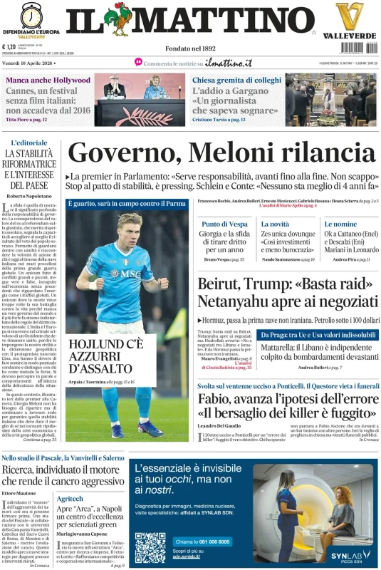 Sette partite per un sogno impossibile. Battendo il Milan, il Napoli sale al secondo posto a -7 dall'Inter. Il calendario degli azzurri permette di sperare e sognare, anche se davvero ci vorrebbe uno scivolone pazzesco dei nerazzurri. "Hojlund c'è, azzurri d'assalto, è guarito, sarà in campo contro il Parma", si legge sulla prima pagina de Il Mattino. Ecco la rassegna stampa di venerdì 10 aprile 2026.