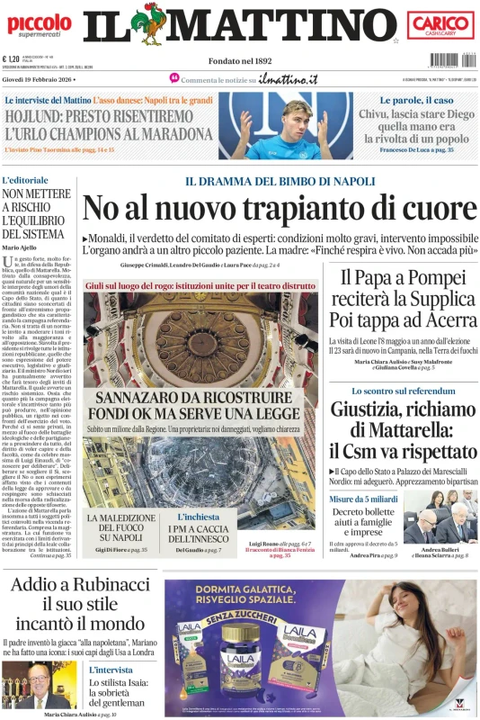 Di seguito le prime pagine dei principali quotidiani di giovedì 19 febbraio 2026.