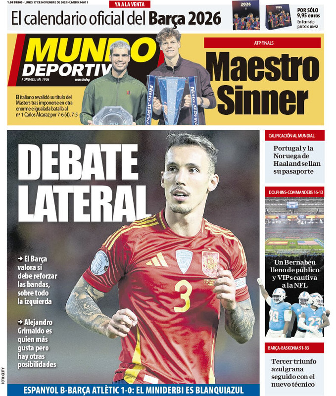 La vittoria di Jannik Sinner alle Atp Finals di Torino contro Carlos Alcaraz, il ko dell'Italia contro la Norvegia e il ritorno di Antonio Conte a Napoli, dopo una pausa. Questo e molto altro sulle prime pagine dei quotidiani nazionali e sportivi in edicola lunedì 17 novembre 2025. Il Mattino apre con "La sfida dei titani! Capolavoro Sinner: trionfa alle Atp Finals dopo un entusiasmante match con il rivale Alcaraz". Poi la Nazionale con "Norvegia scatenata, l'Italia si squaglia". Infine, il Napoli con "Il ritorno di Conte: operazione riscatto".